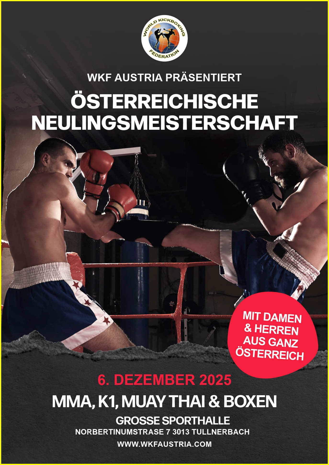 Die „Österreichische Neulingsmeisterschaft“ im Kickboxen und dazu wie jedes Jahr der „Österreichische Jugend-Cup“ findet wie im Terminplan ersichtlich auch am 6. Dezember statt.